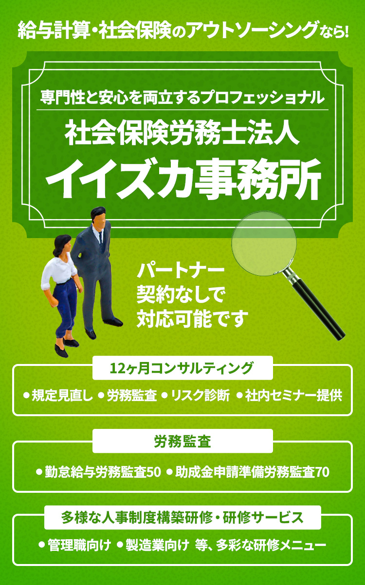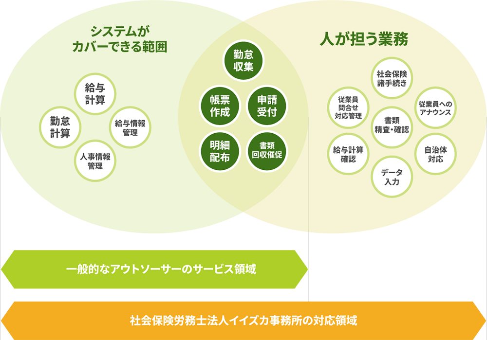 社会保険労務士法人イイズカ事務所では、システムや一般的なアウトソーサーサービスでは網羅できない範囲の業務まで対応可能です。